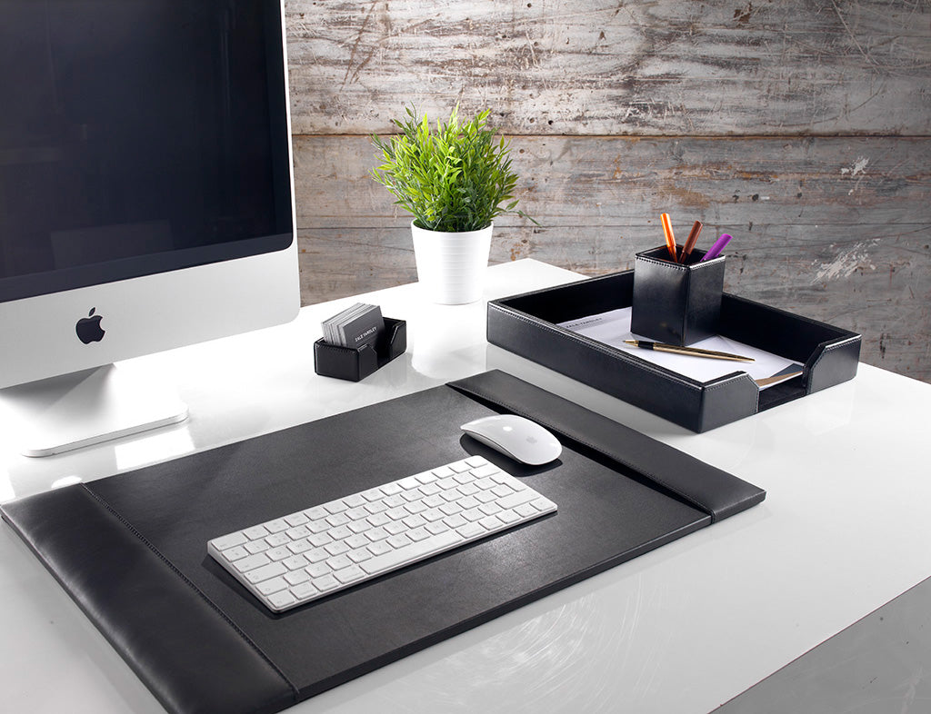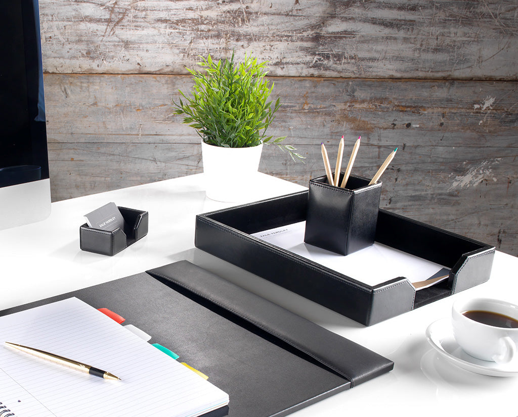 This four piece Classic black bonded leather desk set includes the following items: 1) Desk pad / blotter 2) Letter tray 3) Pen cup and 4) Business card holder. Handmade by our skilled craftsmen, our leather desk sets are crafted in a solid and sturdy internal frame and then bound together using high end bonded leather. The desk sets are finished in quality protective velveteen lining and backing. The solid base on the desk pad provides a smooth writing surface and allows the desktop's surface to be maintained without creating any visual defects. Manufactured from authentic bonded leather this Classic desk set offers great value with its excellent quality and durability at an affordable price. Leather desk sets provide an elegant look and give you everything to organise and decorate your desk to a luxury standard at a cost effective price. Leather office accessories are an ideal corporate gift for fellow professionals, friends, relatives and business partners alike. Leather accessories add a touch of elegance and provide a unique style and look to the office for any distinguished executive.