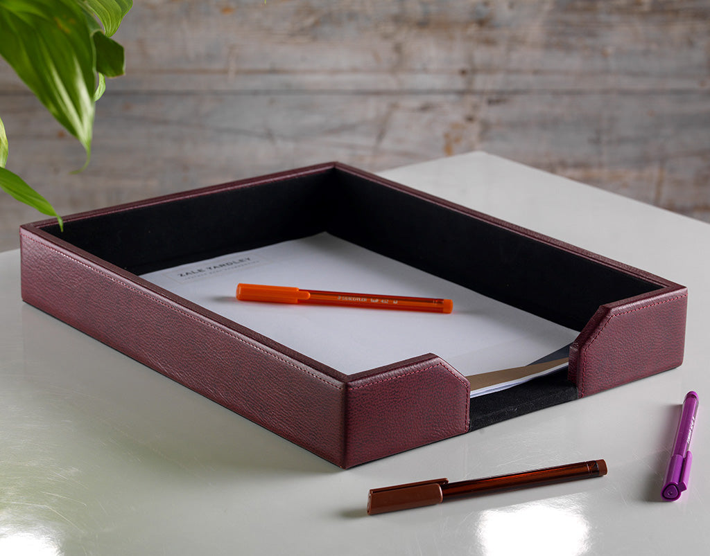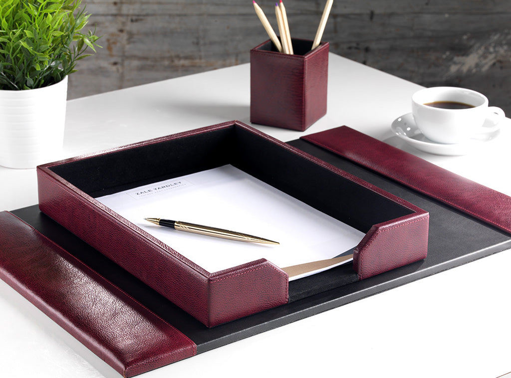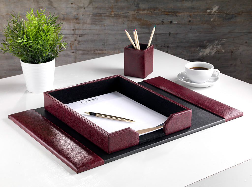 This three piece burgundy cow leather desk set includes the following items: 1) Desk pad / blotter 2) Letter tray 3) Pen cup. Handmade by our skilled craftsmen, our leather desk sets are crafted in a solid and sturdy internal frame and then bound together using authentic Top Grain cow leather. The desk sets are finished in quality protective velveteen lining and backing. The solid base on the desk pad provides a smooth writing surface and allows the desktop's surface to be maintained without creating any visual defects. Manufactured from authentic Top Grain cow leather this desk set is our premium range and offers a luxurious look and feel which will distinguish any office from others. Leather desk sets provide an elegant look and give you everything to organise and decorate your desk to a luxury standard at a cost effective price. Leather office accessories are an ideal corporate gift for fellow professionals, friends, relatives and business partners alike. Leather accessories add a touch of elegance and provide a unique style and look to the office for any distinguished executive.