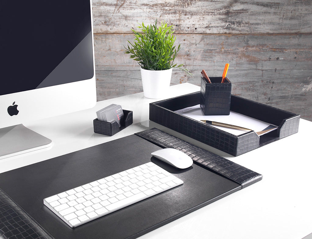 This four piece crocodile embossed leather desk set includes the following items: 1) Desk pad / blotter 2) Letter tray 3) Pen cup 4) Business card holder. Handmade by our skilled craftsmen, our leather desk sets are crafted in a solid and sturdy internal frame and then bound together using authentic cow leather. The desk sets are finished in quality protective velveteen lining and backing. The solid base on the desk pad provides a smooth writing surface and allows the desktop's surface to be maintained without creating any visual defects. This desk set forms part of our Prestige leather desk accessory range and offers a distinguished look and feel for any office. Leather desk sets provide an elegant look and give you everything to organise and decorate your desk to a luxury standard at a cost effective price. Leather office accessories are an ideal corporate gift for fellow professionals, friends, relatives and business partners alike. Leather accessories add a touch of elegance and provide a unique style and look to the office for any distinguished executive.