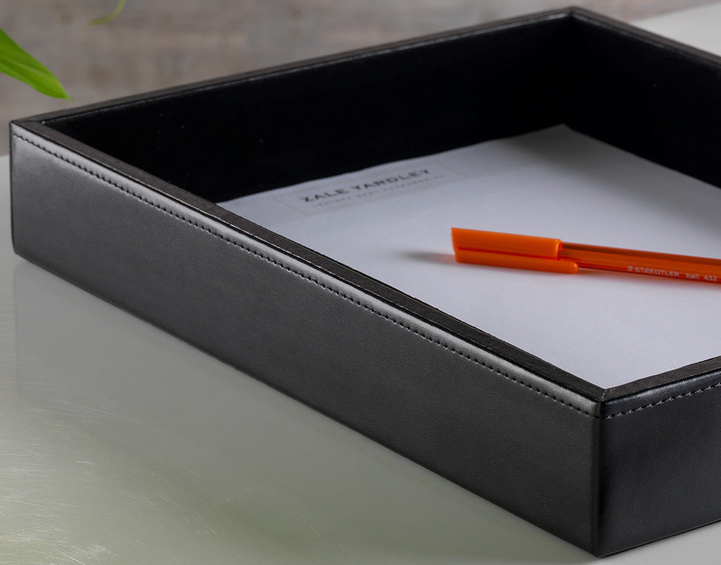 Handmade by our skilled craftsmen, our leather letter trays are crafted in a solid and sturdy internal frame and then bound together using high end bonded leather. The letter trays are finished in quality protective velveteen lining and backing. This letter tray forms part of our Classic black bonded leather desk accessory range and offers great value with its excellent quality and durability at an affordable price. Leather desk sets provides an elegant look and give you everything to organise and decorate your desk to a luxury standard at a cost effective price. This desk set combines our most popular office desk accessories and includes a desk pad, supplemented by a perfectly matching letter tray, pencil cup, memo holder, business card holder, magazine holder and letter opener. Leather office accessories are an ideal corporate gift for fellow professionals, friends, relatives and business partners alike. Leather accessories add a touch of elegance and provide a unique style and look to the office for any distinguished executive.