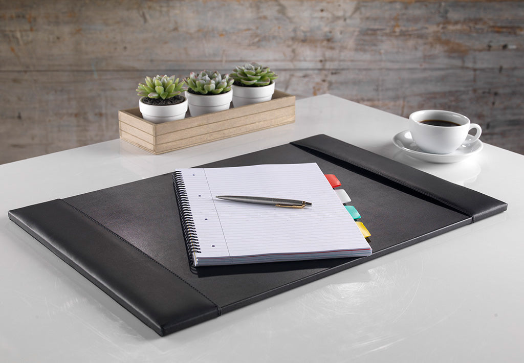 Handmade by our skilled craftsmen, our leather desk pads are crafted in a solid and sturdy internal frame and then bound together using high end bonded leather. The desk pad is finished in quality protective velveteen lining and backing. The solid base provides a smooth writing surface and allows the desktop's surface to be maintained without creating any visual defects. This desk pad / blotter forms part of our Classic black bonded leather desk accessory range and offers great value with its excellent quality and durability at an affordable price. Leather desk sets provide an elegant look and give you everything to organise and decorate your desk to a luxury standard at a cost effective price. Leather office accessories are an ideal corporate gift for fellow professionals, friends, relatives and business partners alike. Leather accessories add a touch of elegance and provide a unique style and look to the office for any distinguished executive.