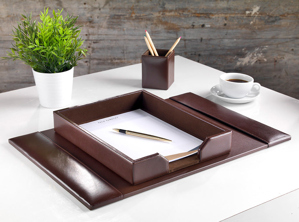 Classic Brown Bonded Leather Three Piece Desk Organiser Set