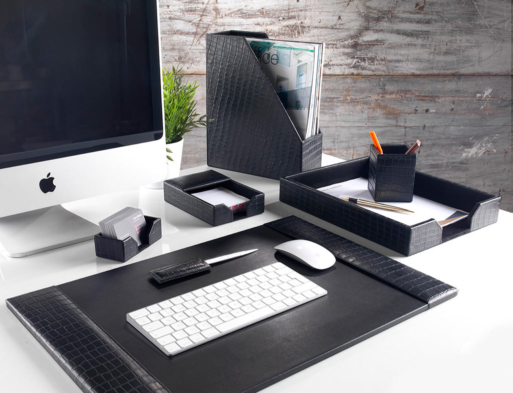 This seven piece crocodile embossed leather desk set includes the following items: 1) Desk pad / blotter 2) Letter tray 3) Pen cup 4) Business card holder 5) Letter opener 6) Memo holder 7) Magazine rack. Handmade by our skilled craftsmen, our leather desk sets are crafted in a solid and sturdy internal frame and then bound together using authentic cow leather. The desk sets are finished in quality protective velveteen lining and backing. The solid base on the desk pad provides a smooth writing surface and allows the desktop's surface to be maintained without creating any visual defects. This desk set forms part of our Prestige leather desk accessory range and offers a distinguished look and feel for any office. Leather desk sets provide an elegant look and give you everything to organise and decorate your desk to a luxury standard at a cost effective price. Leather office accessories are an ideal corporate gift for fellow professionals, friends, relatives and business partners alike. Leather accessories add a touch of elegance and provide a unique style and look to the office for any distinguished executive.