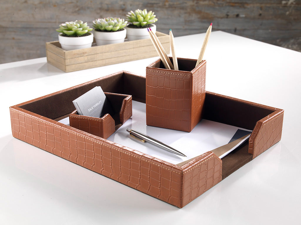 Prestige Tan Brown Crocodile Embossed Leather Three Piece Small Desk Organiser Set