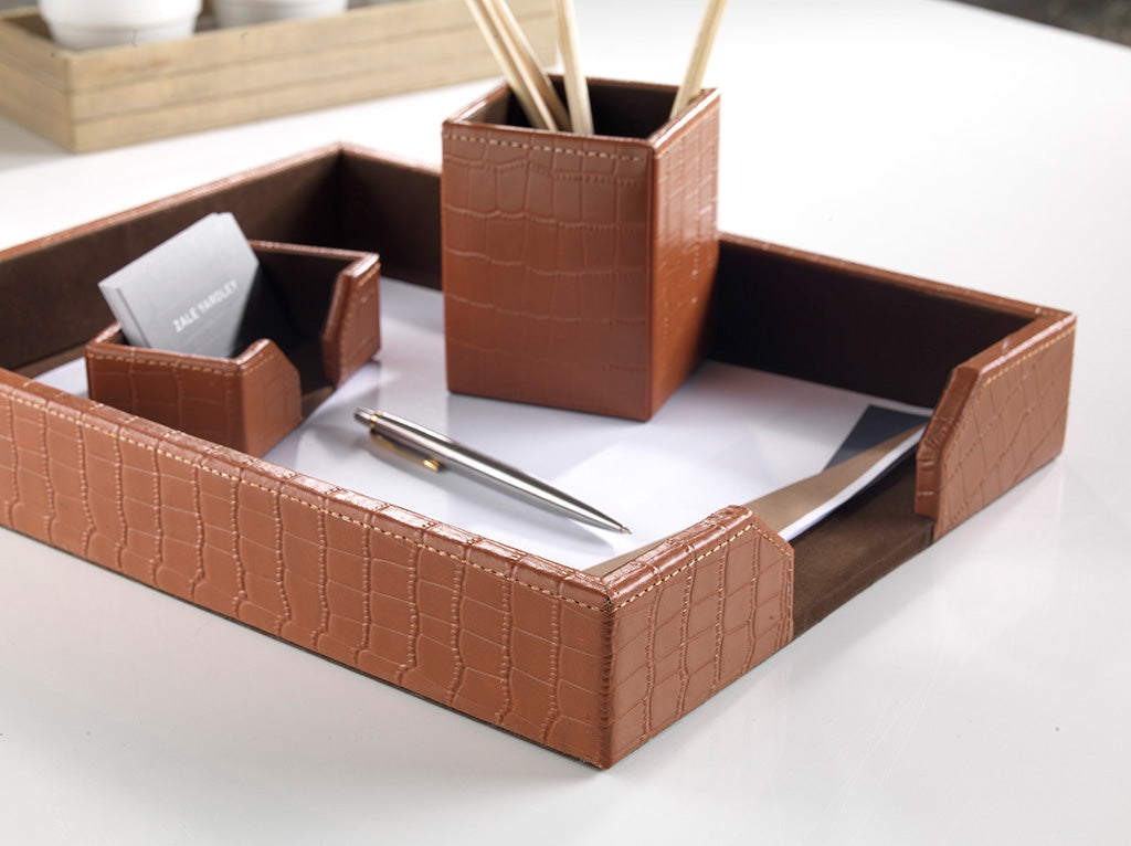 This three piece small desk organiser set includes a: 1)Letter tray 2) Pen cup 3) Business card holder. This small leather set allows the main stationery items on an office desk including letters, memos, pen , pencils and business cards to be organised whilst signifying a professional and prestigeous look to the office. Handmade by our skilled craftsmen, our leather desk sets are crafted in a solid and sturdy internal frame and then bound together using authentic cow leather with a crocodile embossed design. The desk sets are finished in quality protective velveteen lining and backing. Manufactured from authentic cow leather this desk set forms part of our Prestige range and offers a luxurious look and feel which will distinguish any office.